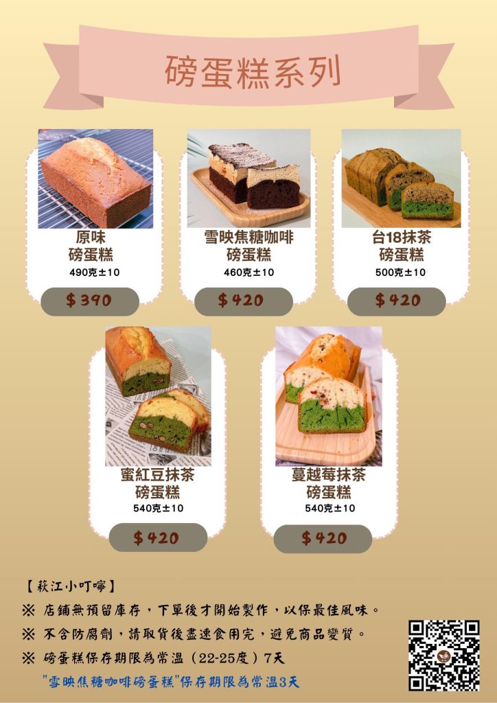 甜品專區 萩江預購~磅蛋糕系列 2025 年 4 月 23 日 / 分享給朋友 磅蛋糕系列⭐️原味磅蛋糕 490克±10⭐️雪映焦糖咖啡磅蛋糕 460克±10 ⭐️台18 抹茶磅蛋糕 500克±10 ⭐️蜜紅豆抹茶磅蛋糕 540克±10 ⭐️蔓越莓抹茶磅蛋糕 540克±10 ⚠️不含防腐劑,請盡速取貨,避免商品變質【萩江小叮嚀】 💥店鋪無預留庫存,下單後才開始製作,以保最佳風味。 💥最佳賞味期 5天;常溫5-7天,冷藏15天,冷凍45天。